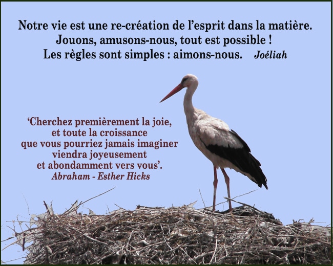 ‘Si nous vous avions parlé le premier jour de votre arrivée ici, nous vous aurions dit : « Bienvenue sur la planète Terre. Il n’y a rien que vous ne puissiez être, ou faire, ou avoir. Et votre travail ici — votre plan de carrière — est de chercher la joie. En pensant à des choses qui sont bonnes pour vous, vous serez en harmonie avec qui-vous-êtes-réellement. Et ce faisant vous utiliserez votre liberté profonde. Cherchez premièrement la joie, et toute la croissance que vous pourriez jamais imaginer viendra joyeusement et abondamment vers vous. ‘